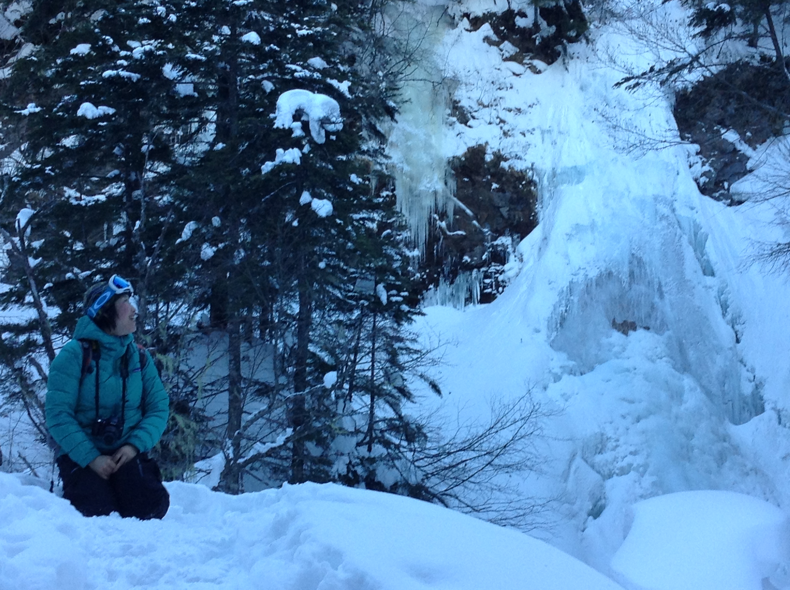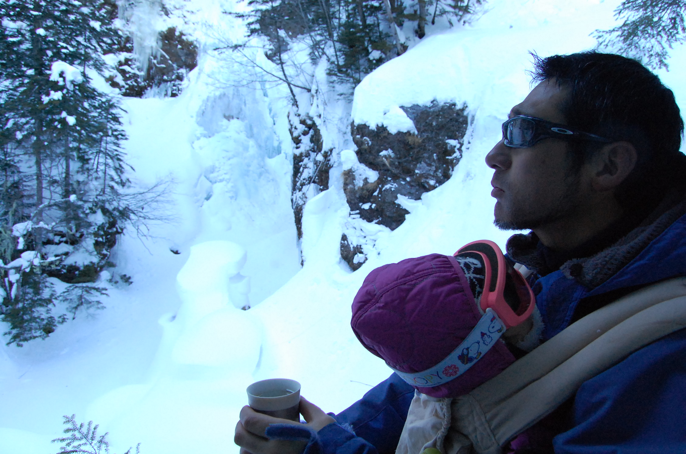 16日の午後はスキーをはいてリフトに乗って、三本滝を見に行きました。