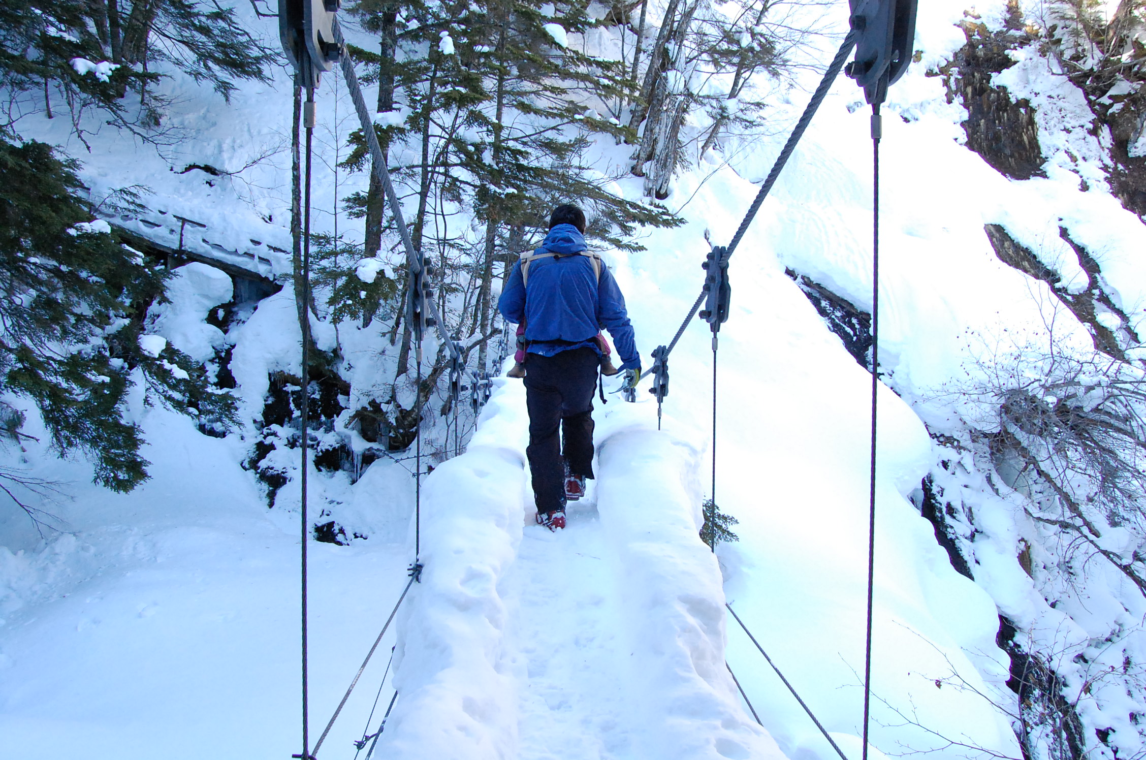 一番の難所、つり橋の積雪が手すりをまだ越えていなかったのでなんとか渡れました。