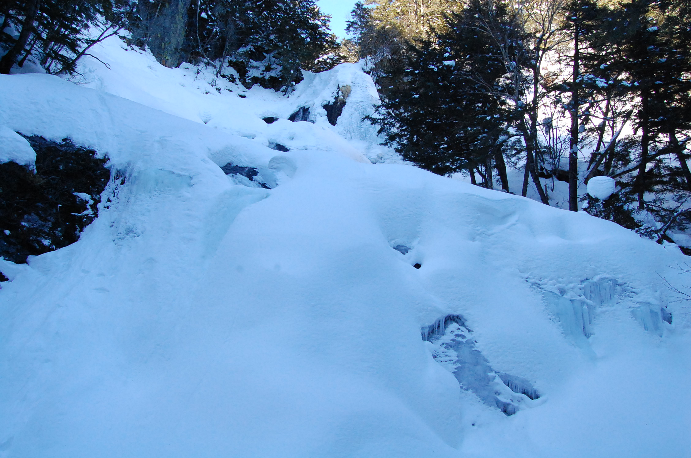 黒い岩を白い滝がなめらかに伝うように流れるクロイ沢は雪で真白に。