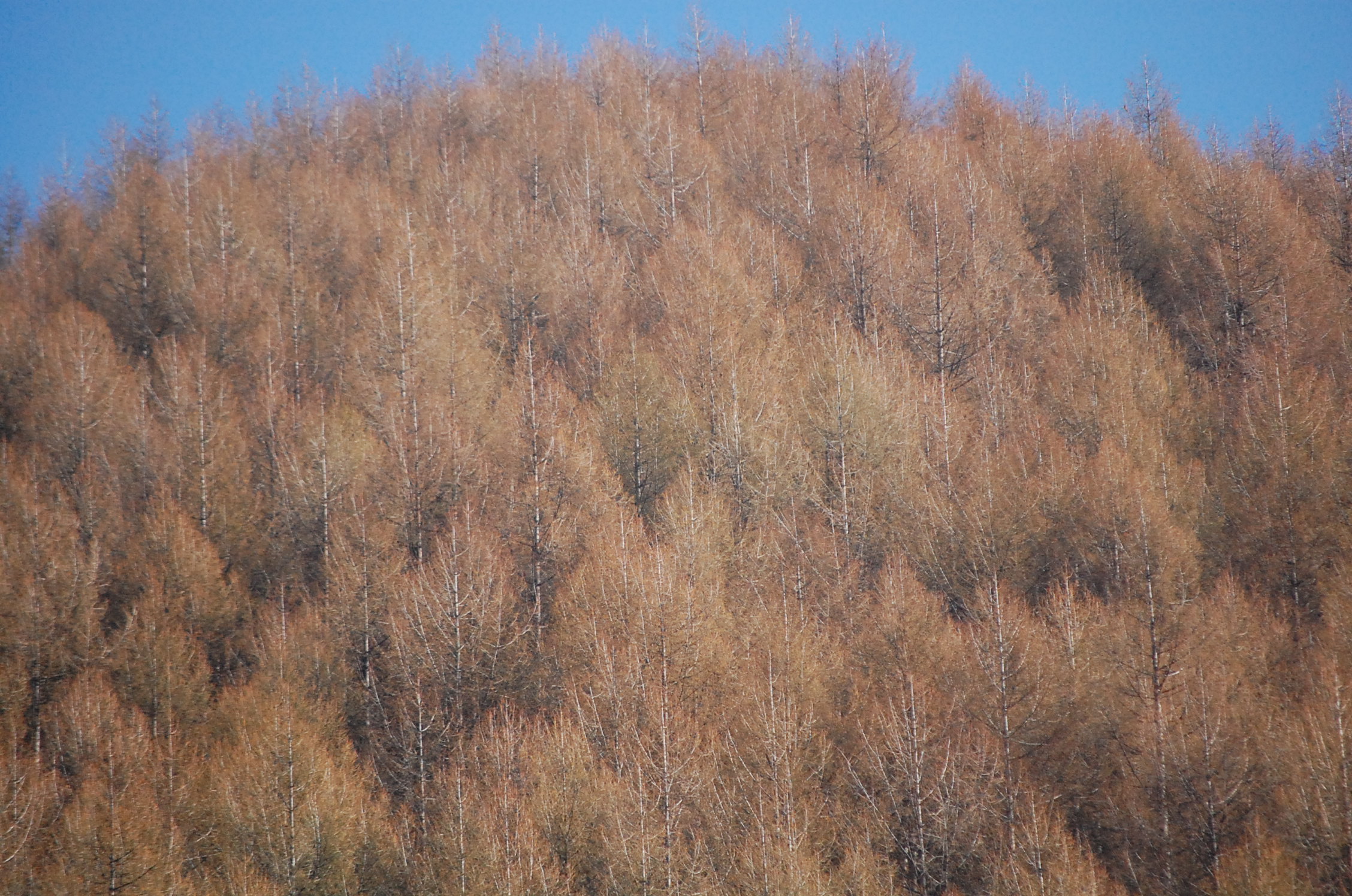 お隣のカラマツ山も新芽を出す準備中。ほんの少~しですが黄緑が見えますか?