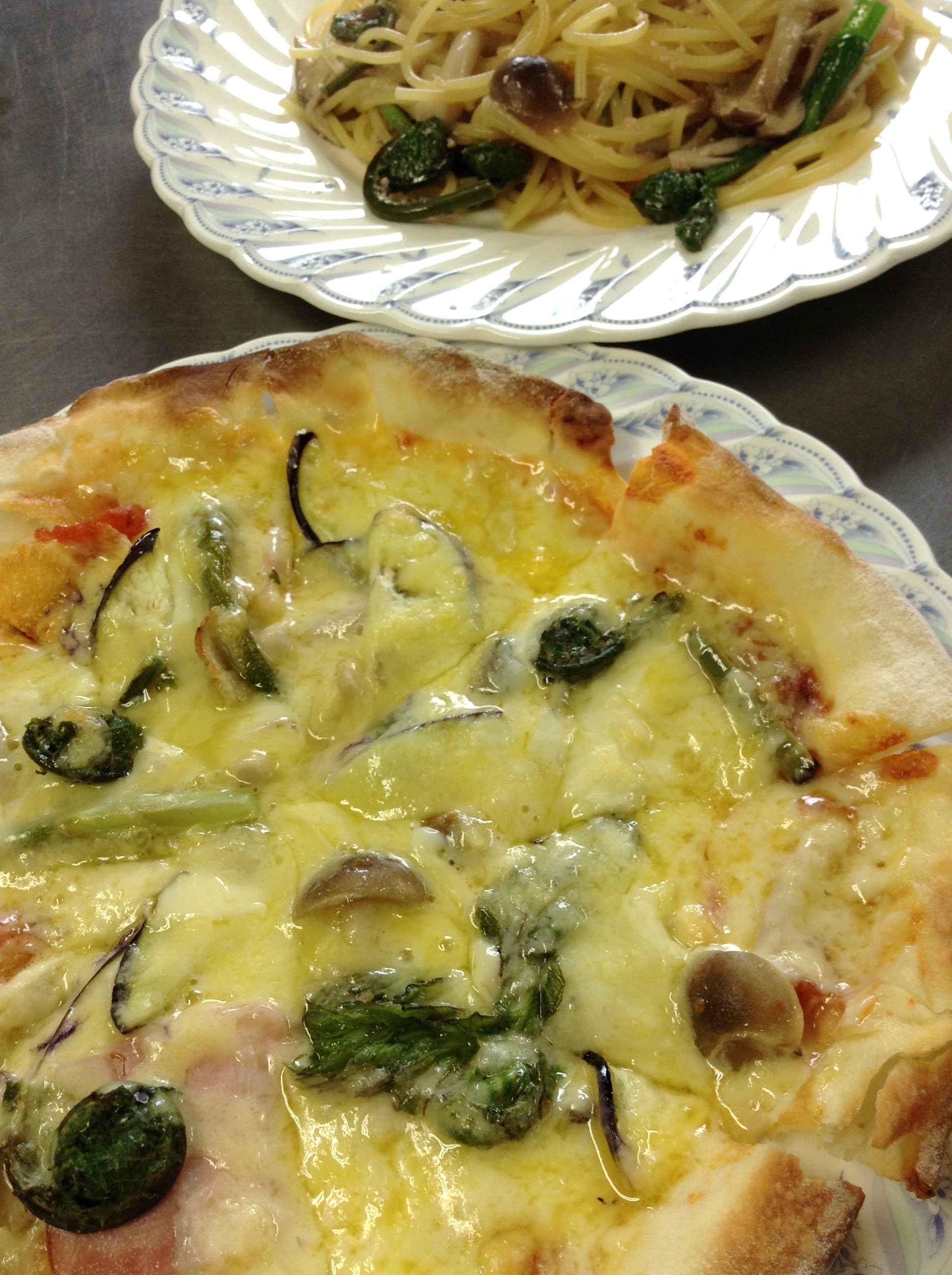 山菜がある間だけの期間限定でアルム風ピザにこごみやタラノメが入ります。