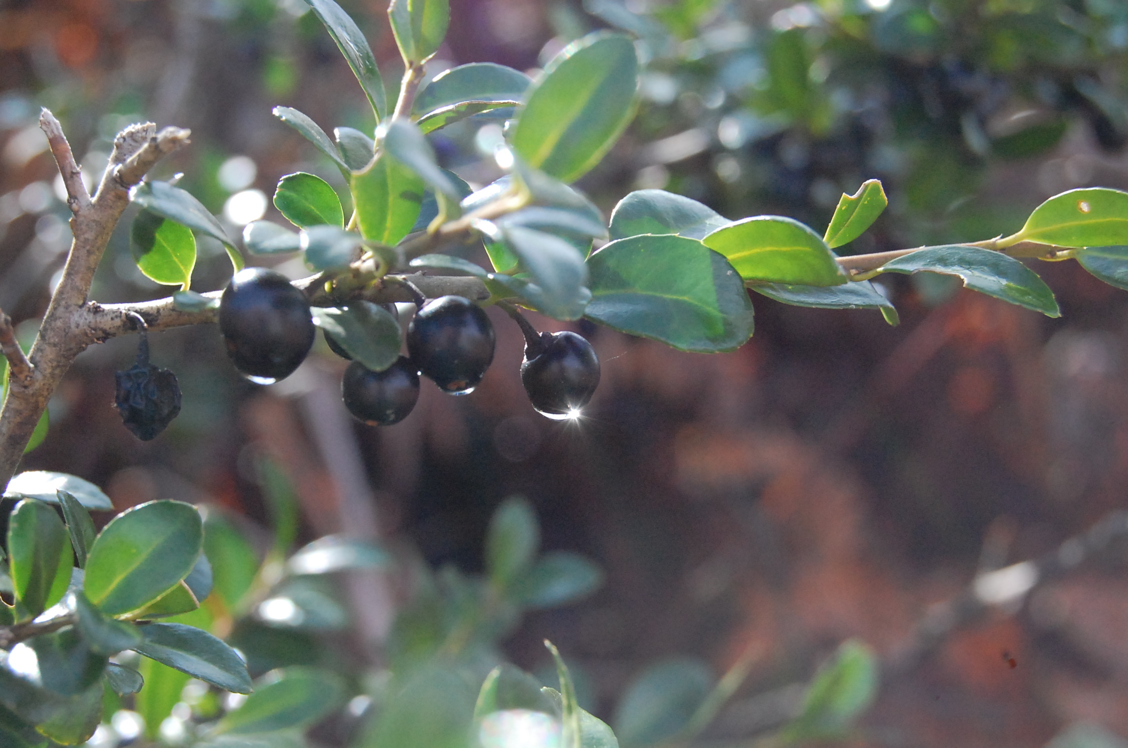 ツゲの実に朝日が輝いていました。