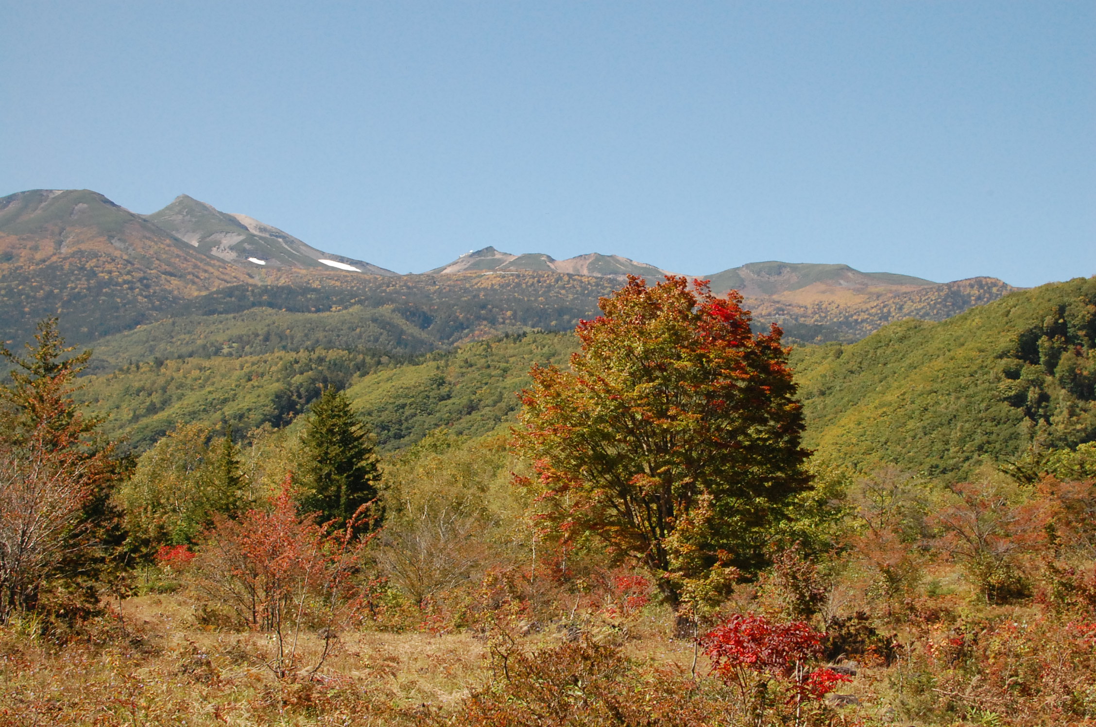 岐阜県との県境付近から富士見の沢、位ヶ原山荘を望む。