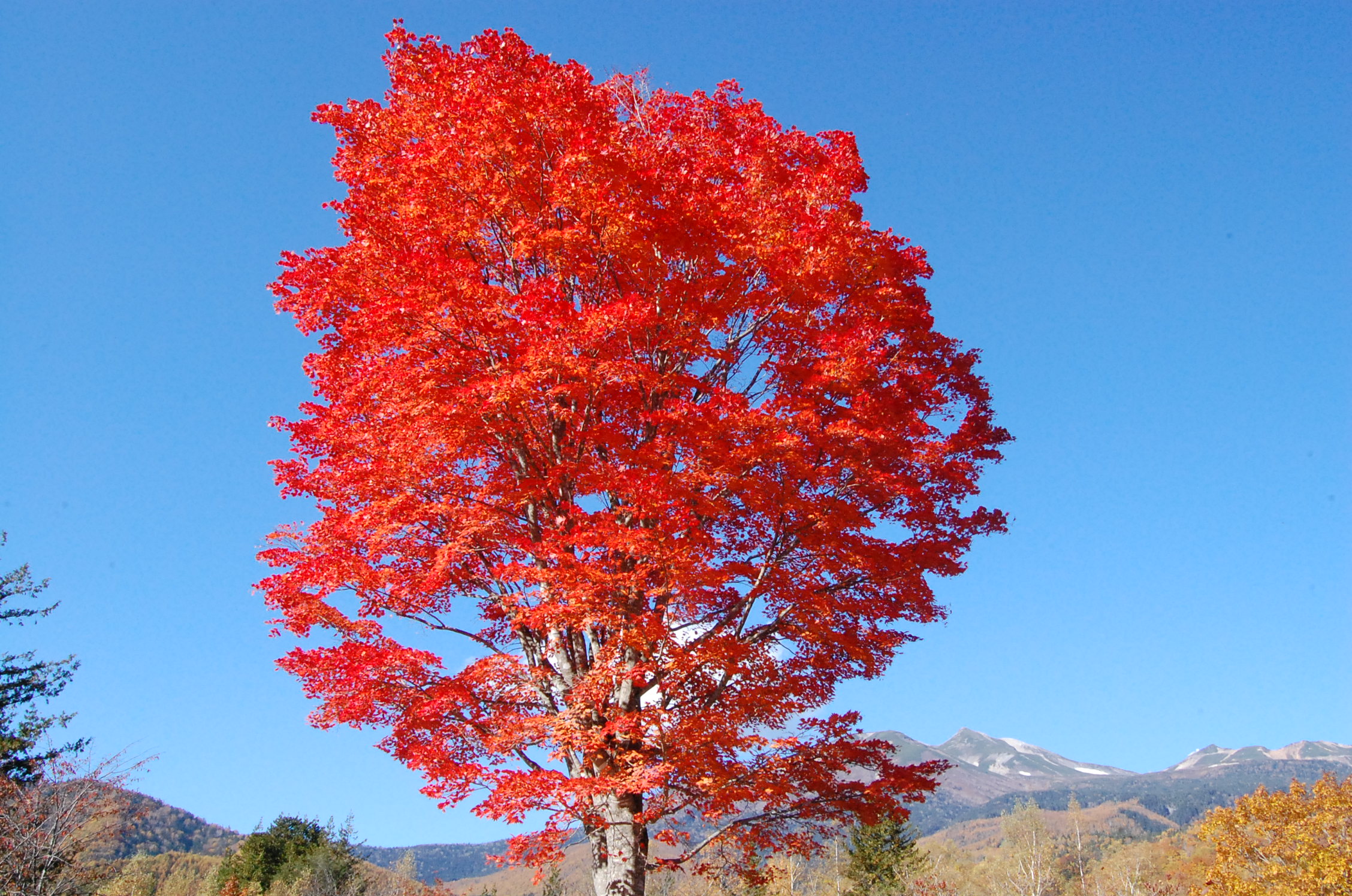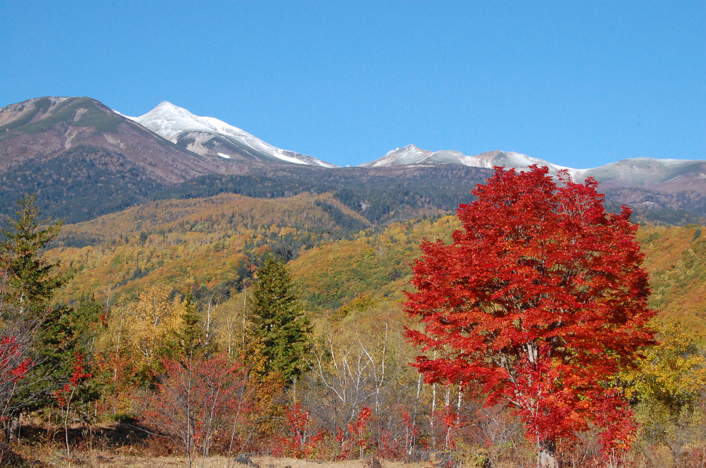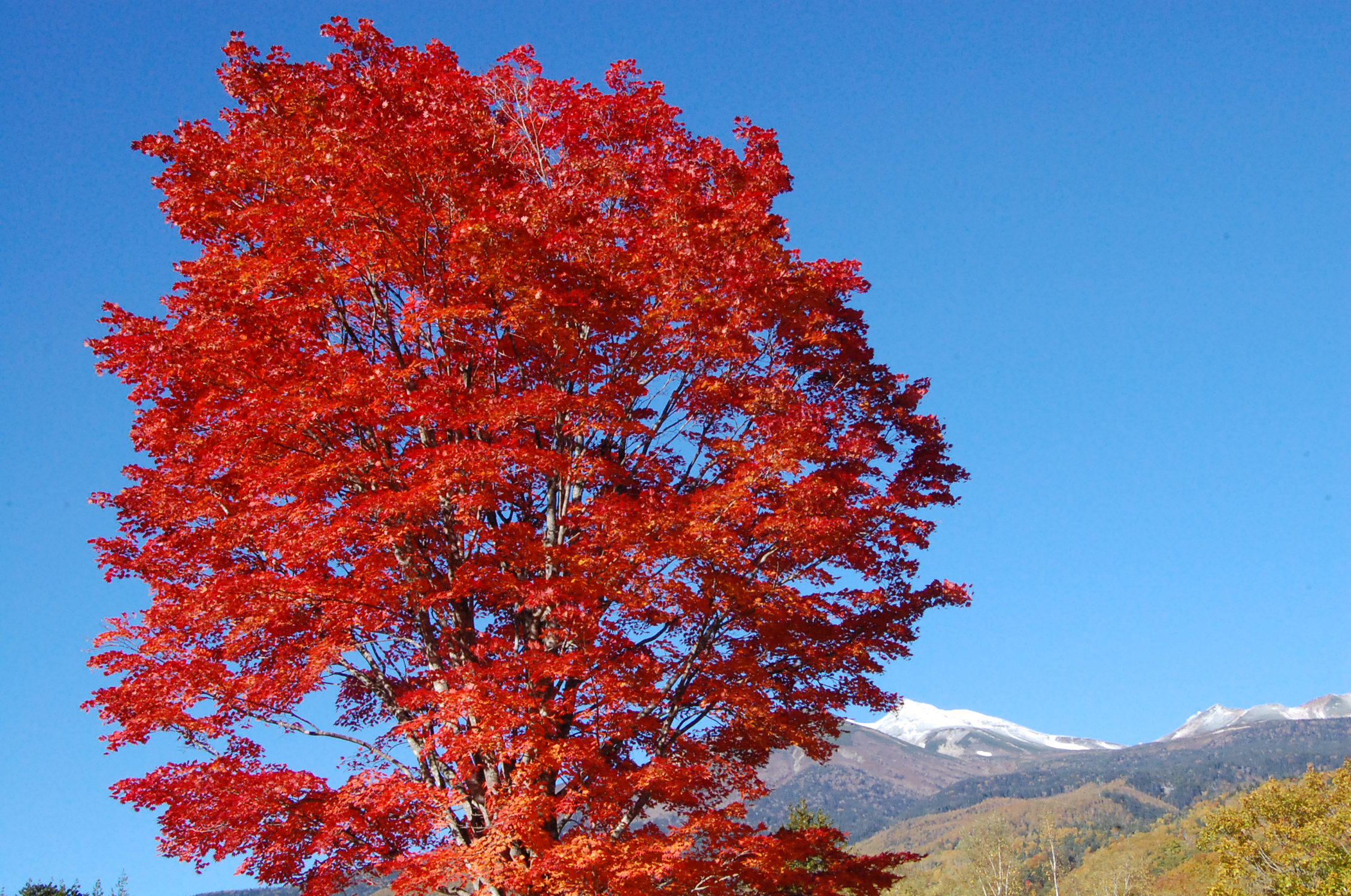 真っ白な乗鞍岳と真っ赤なオオカエデ。