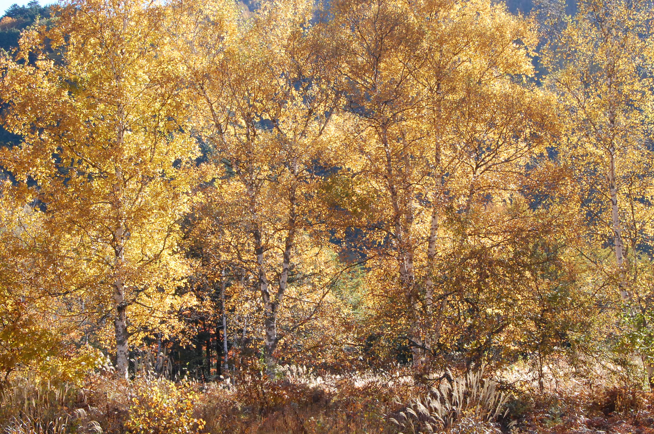 白樺の黄色い葉に朝日が入り、金色に輝きます。