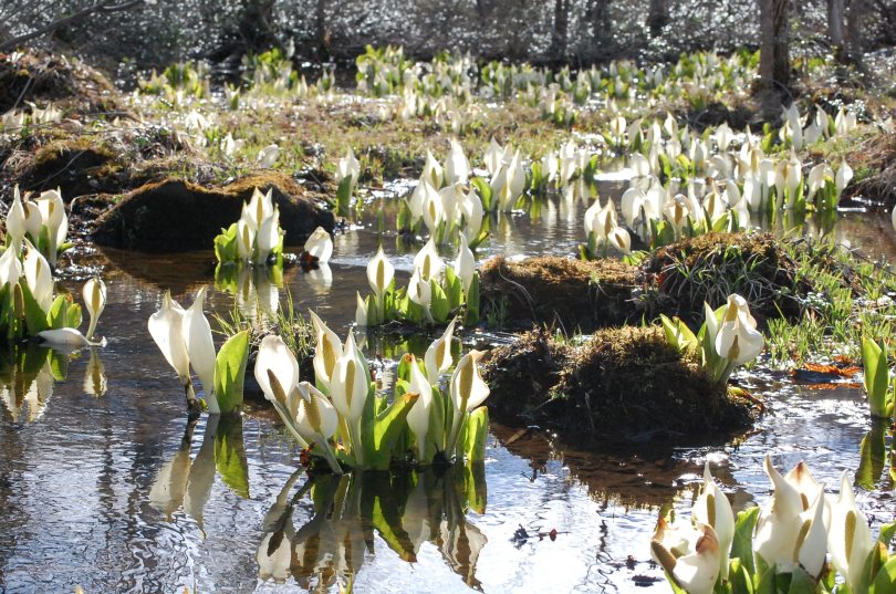 水芭蕉の開花ピークにはかわいい白いずきんの水芭蕉たちが身を寄せ合っておしゃべりしているような