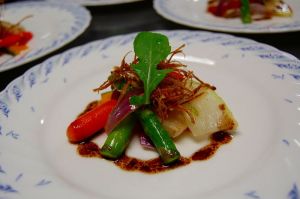 岩魚のパイ包みと山菜こごみのソース。ホテル創業以来のメニュー。リクエスト頂ければご用意できます。ご予約時にお申し付け下さい。
